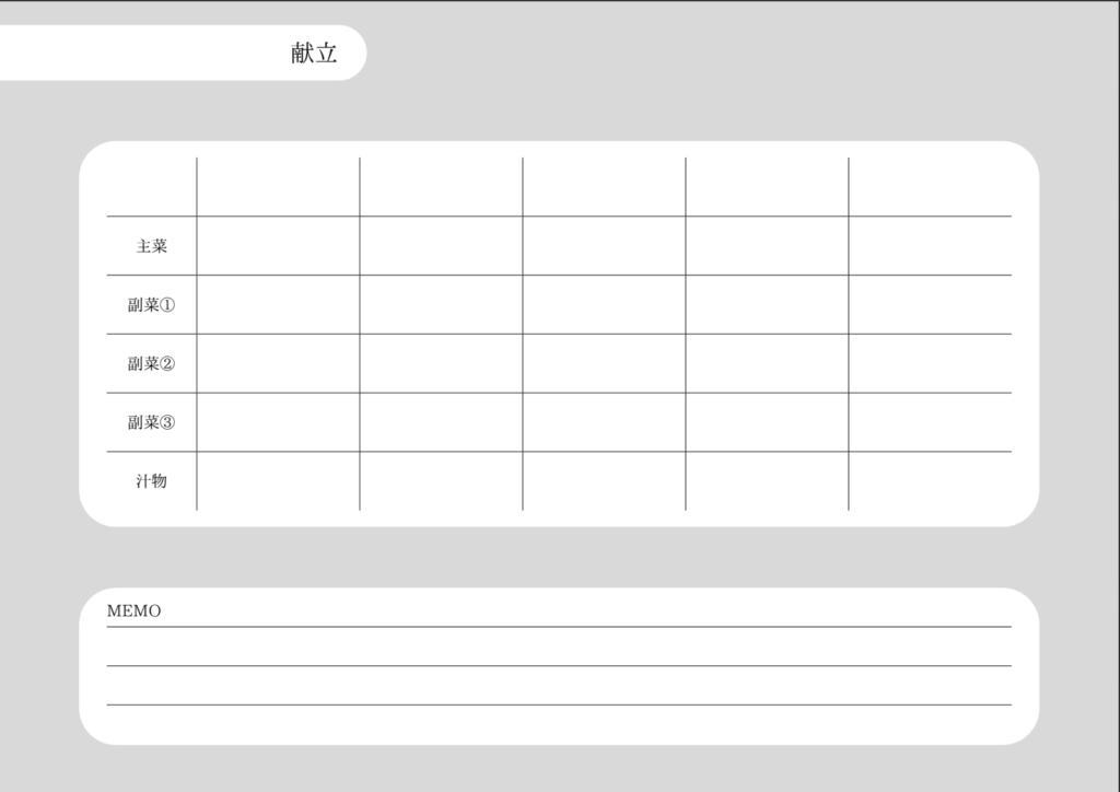 縦方向に「主菜・副菜①・副菜②・副菜③・汁物」、横方向に「曜日」が並んでいて、下のメモ欄には買い足したい食材や作り置きの予定を書けるようになっています。